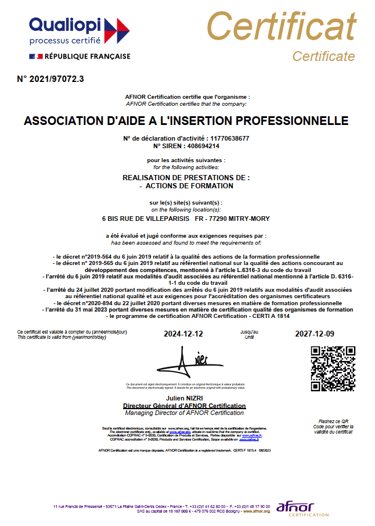 L'AIP Centre De Formation a souhaité répondre aux exigences qualité vis-à-vis de la loi, des commanditaires, des partenaires et de ses apprenants. C'est pourquoi nous avons demandé à être audité par AFNOR CERTIFICATION, qui nous a délivré la certification Qualité au titre de la catégorie ACTIONS DE FORMATION, depuis le 10 décembre 2021